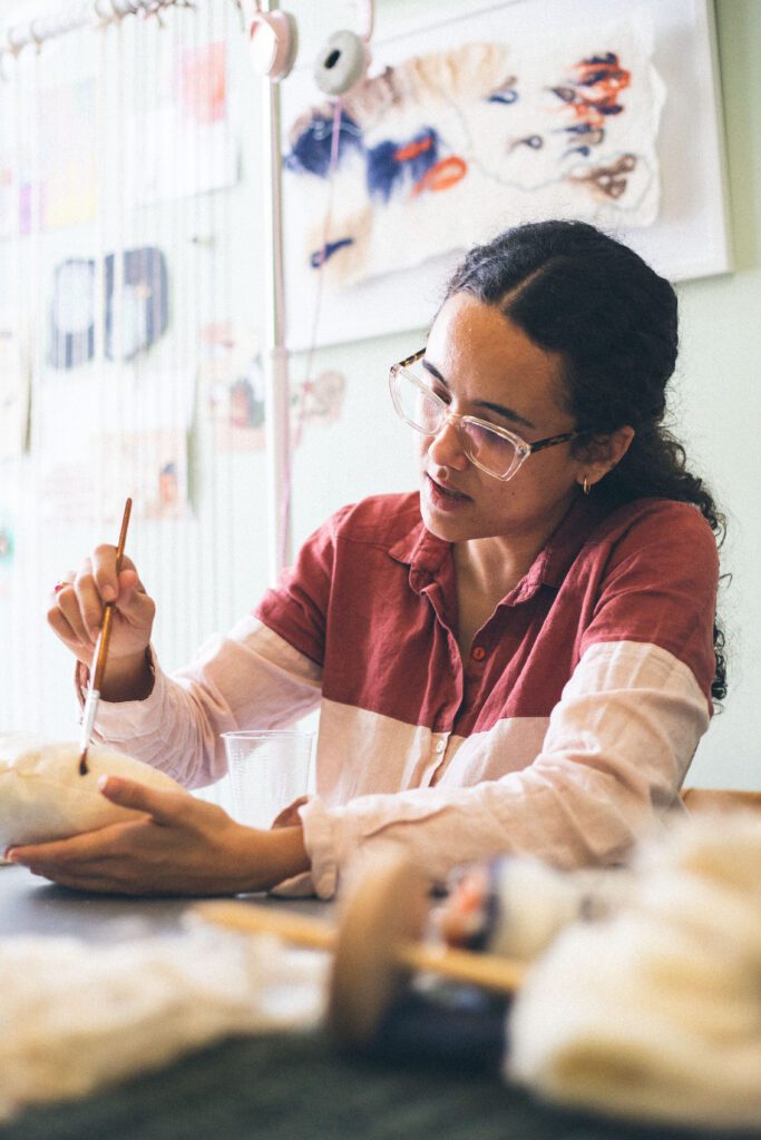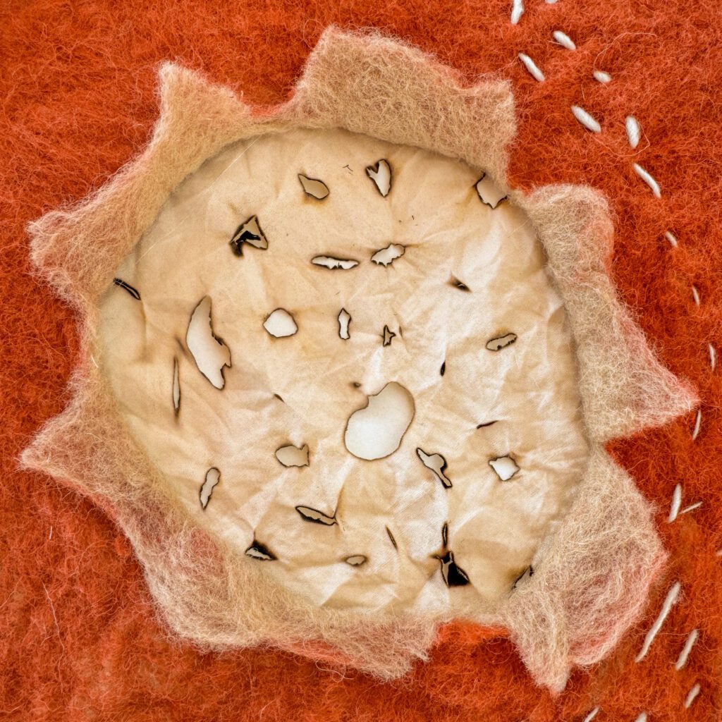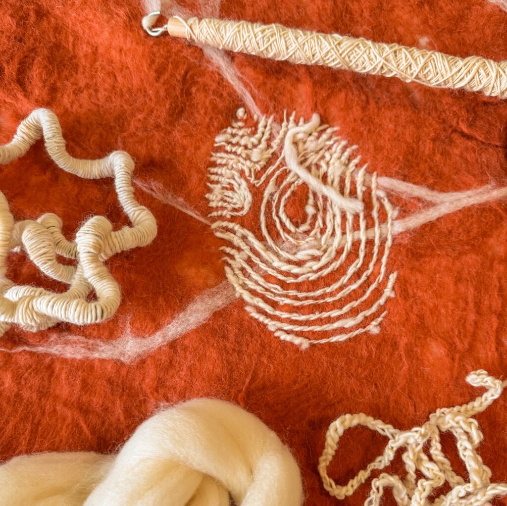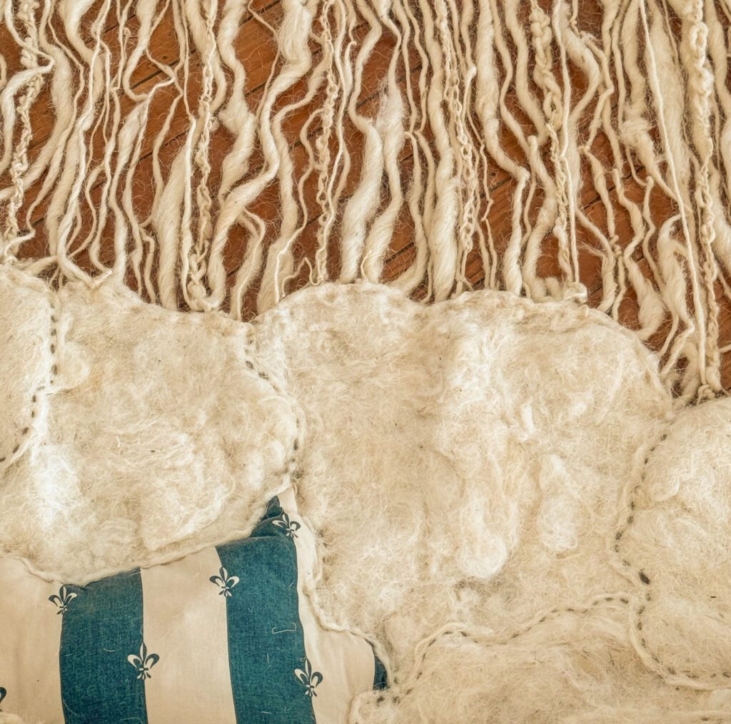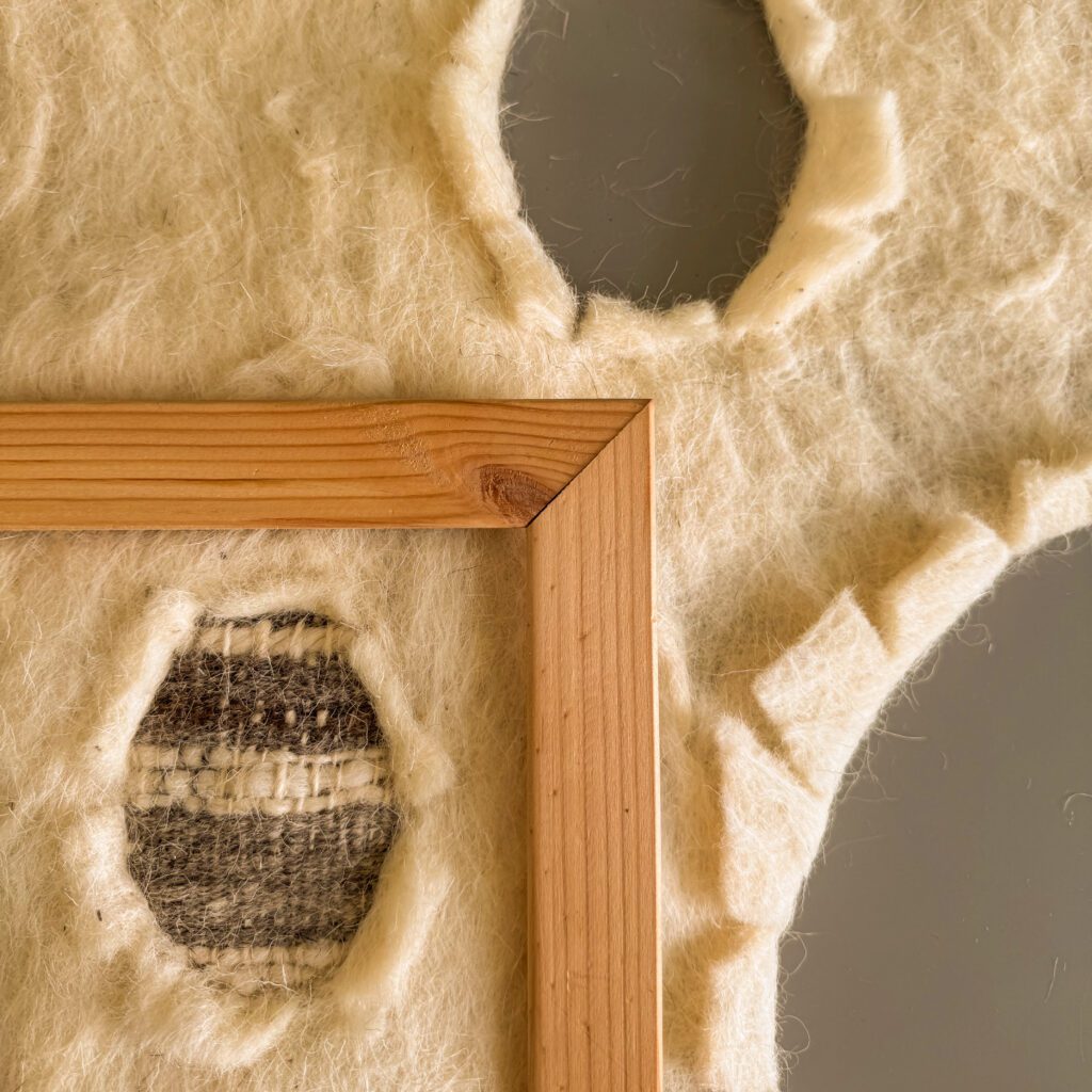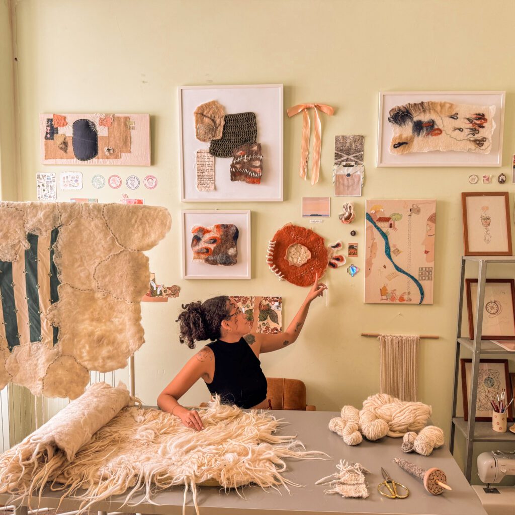 Através de fibras, tecidos e gestos, o meu trabalho explora temas como tempo, ancestralidade, corpo, feminismo, território e sustentabilidade. Ao viver durante muitos anos na “Cidade da Lã” de Portugal, desenvolvi uma forte ligação ao seu patrimônio, enquanto uma pausa criativa me permitiu mergulhar nas comunidades locais e aprender práticas têxteis ancestrais. Desde então, a lã tornou-se central na minha pesquisa, incorporando tanto a memória quanto a resistência. Minhas peças tecem um diálogo espiritual com meus ancestrais e fragmentos de mim mesma, trazendo tecidos tradicionais, fibras de diversas origens, materiais reutilizados e texturas coletadas da vida cotidiana para composições abstratas e táteis. Elas contam histórias por meio da matéria, do silêncio e da memória compartilhada.